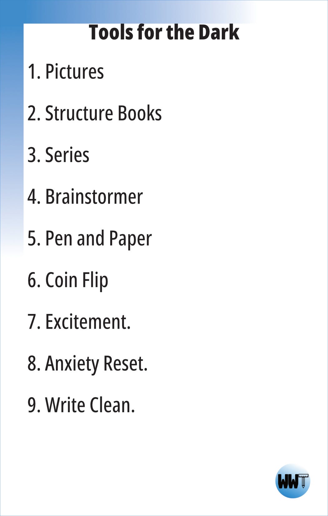 As mentioned before, I’m making a deck of craft cards to quickly remind myself of techniques while also having a convenient place to keep track of elements like character, conflict, and theme specific to each story. This week’s card is tools for the dark.